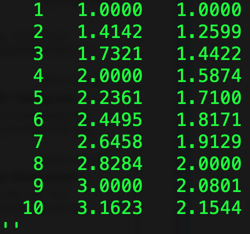 i,sqrt(i),i**(1/3)) && ''