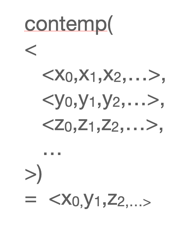 Can we do better? I think so, and I’m going to outline a proposal. The idea is to use operations (I call them”hyper filters”) that work on streams (I call them “hyperstreams”) that are functions of a whole sequence t0,t1,t2,… of time parameters, not just t0 as with ordinary streams. The idea is that t0 is inner, local time, t1 is time in the enclosing loop, t2 time in the second outer loop, and so on.