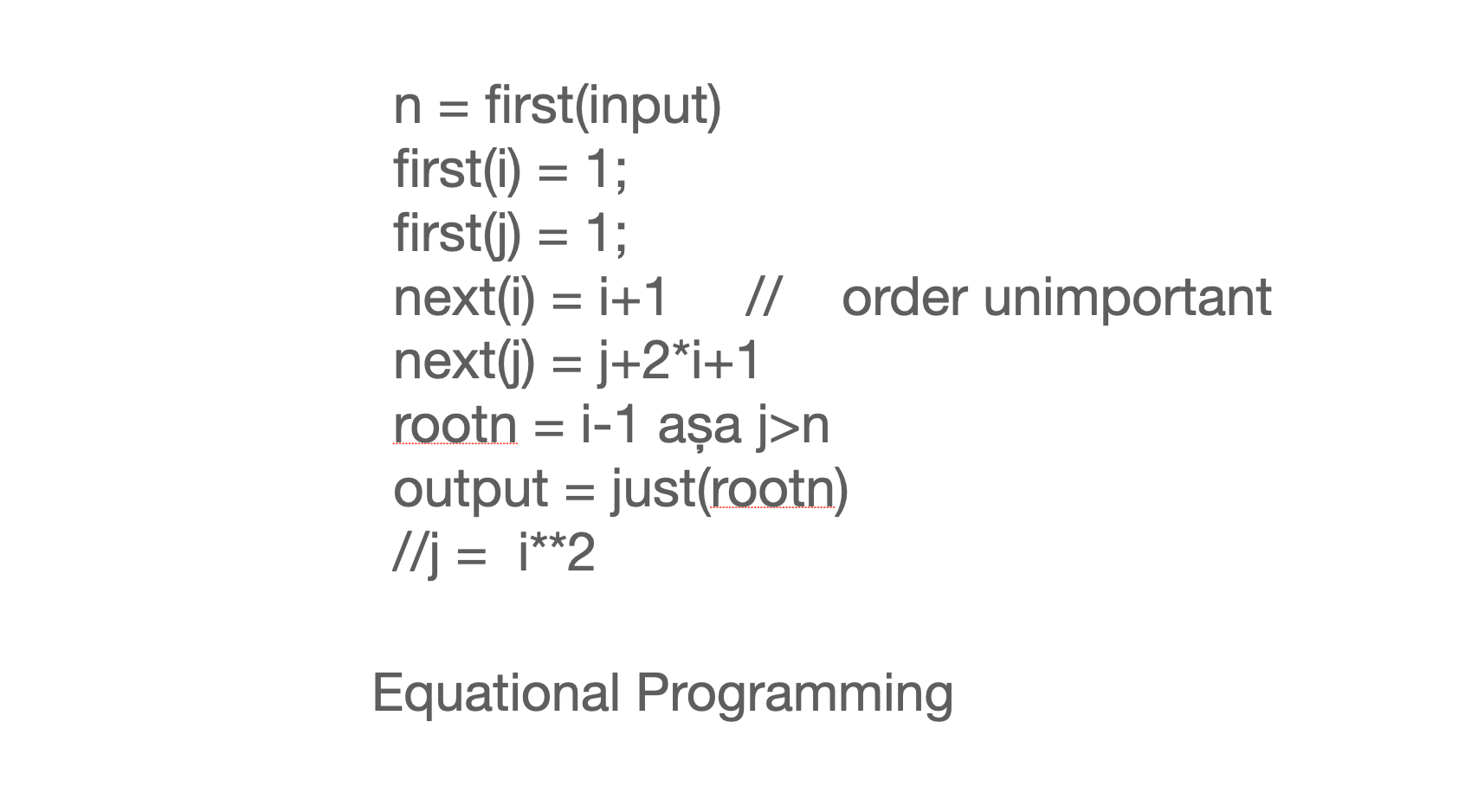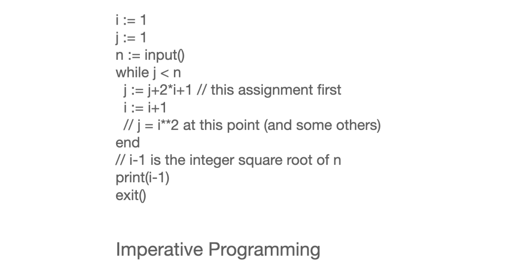 I was specially pleased to discover a simple induction rule that allowed you to prove invariants like j = i**2 directly from the program statements, which double as axioms from which properties of the program can be derived logically.