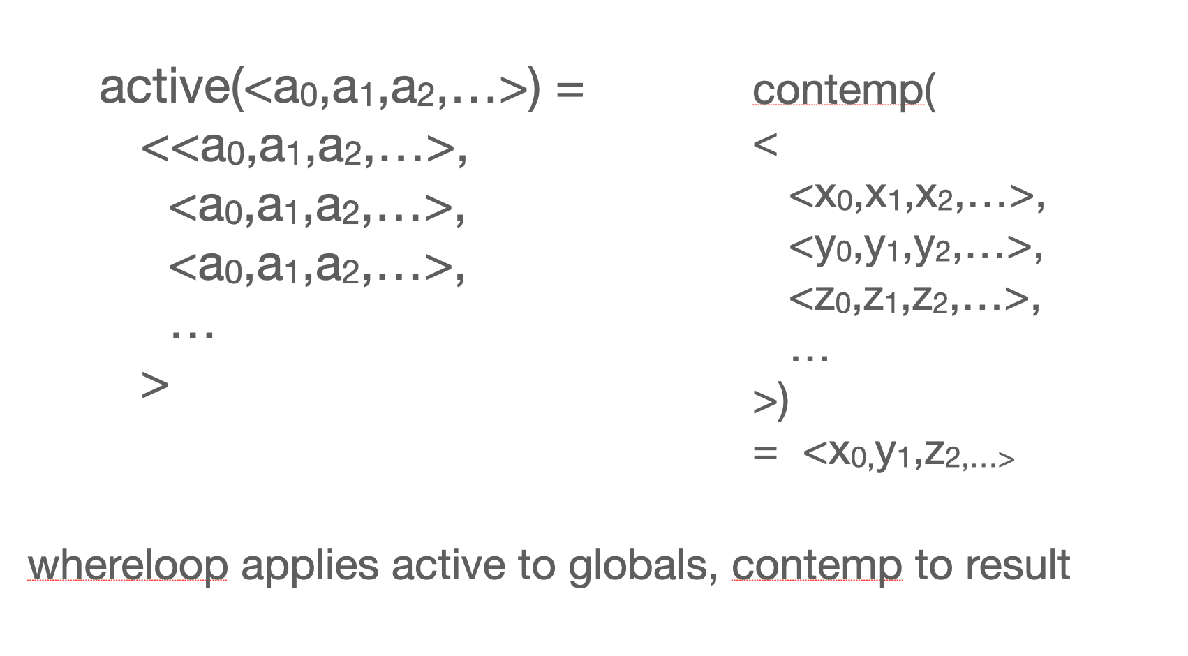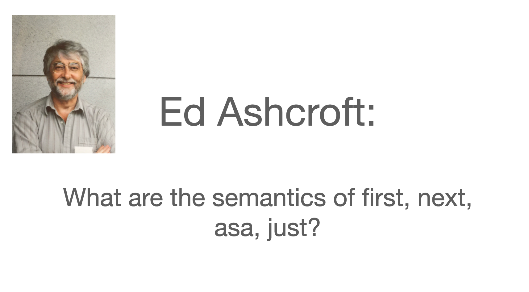 I was so excited I left my windowless office in the Pure Math corridor and went to see my good friend Ed Ashcroft in the Computer Science corridor. As we sat by his window (he had one) I explained my discovery. He thought it was interesting but asked, what are the semantics? What’s being equated? He’d promised himself never to work on schemes that don’t have semantics.