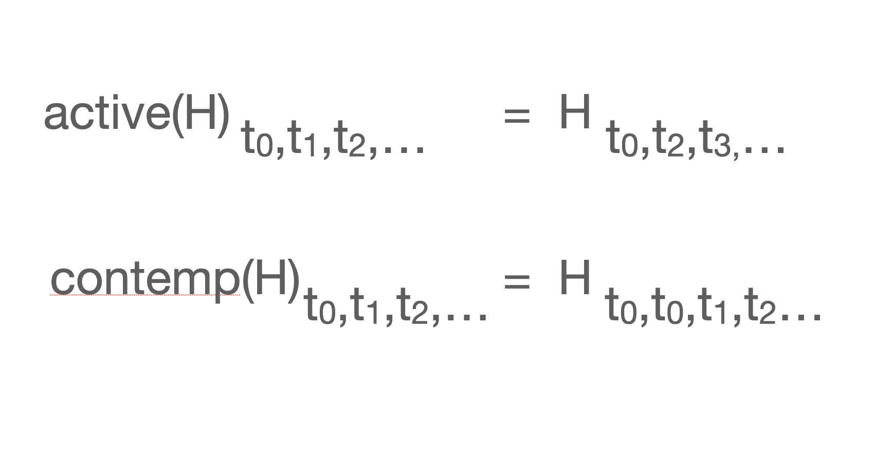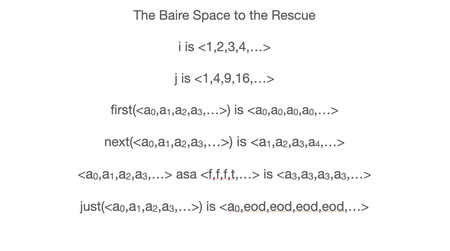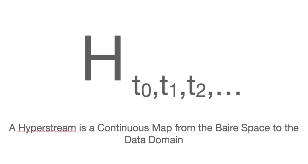 Anybody familiar with the Baire Space should have seen it in a minute but it took me about 6 weeks. Finally I was doodling on a filing card in my windowless office and the above struck me. Of course! The equations are between infinite sequences, that can be thought of as histories (later, streams). I shot out of my windowless office, down the Pure Math corridor, into the Computer Science corridor and then Ed’s be-windowed office. He was convinced and we began collaborating.