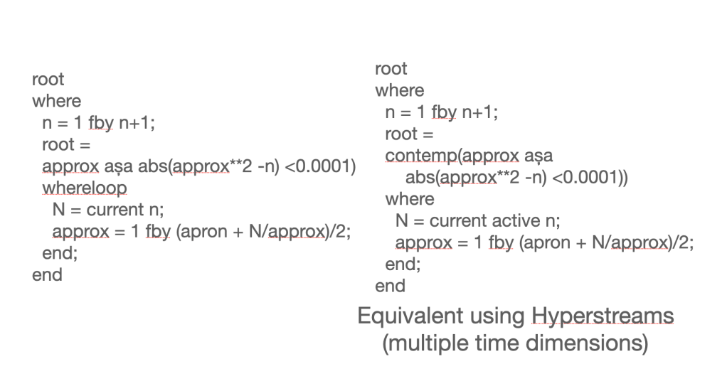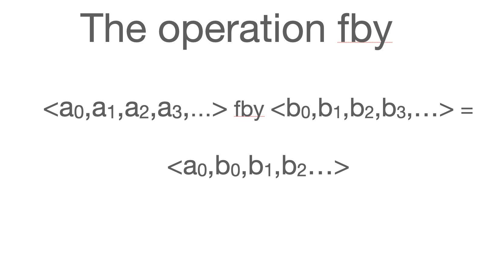 Among the first things we came up with was the operation fby, which doesn’t have an analog in imperative programming.