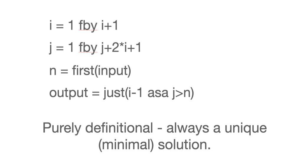 The fby operation allowed us to combine pairs of equations so that the program is purely definitional. You can show (as Ed pointed out) that it always has a unique minimum solution. So you don’t need special rules to ensure programs are meaningful.