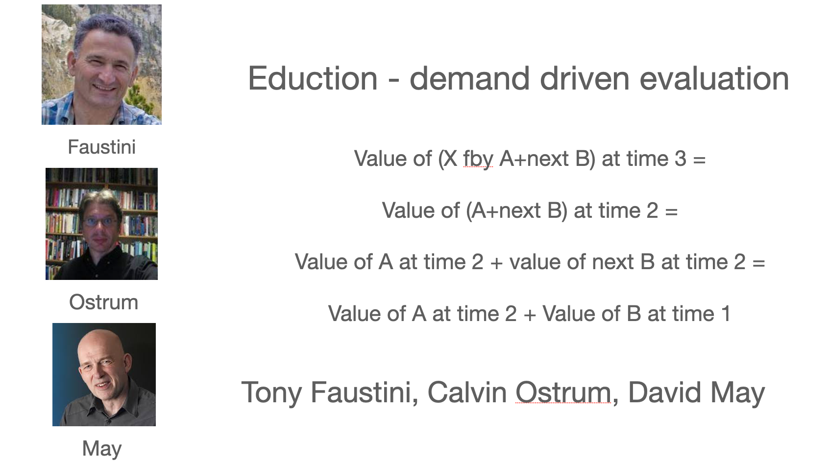 One thing that bothered us was that the programs seems to go on forever – the sequences are infinite, after all. The solution was lazy evaluation, so only those values actually needed are computed. David May, then a grad student, came up with the idea as did (independently) one of Ed’s students. Calvin Ostrum generalized it and Tony Faustini refined it.