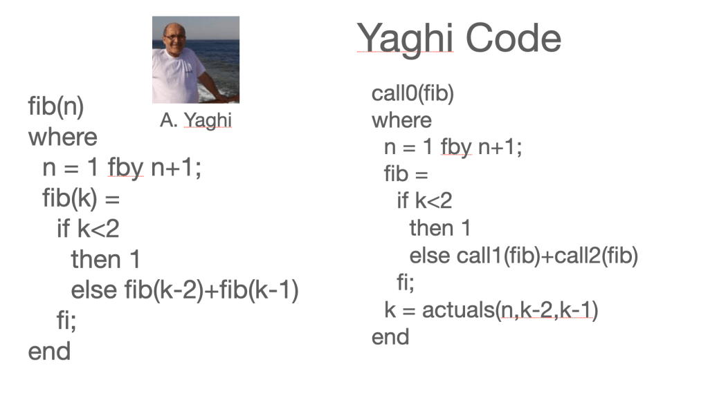 There was one hitch, user defined functions. How do you evaluate fib(n) at time 4? Fortunately we came up with a coding scheme which eliminated user defined functions and manipulated what we called the “place” dimension, which indicated a place in the function calling tree. Ostrum had figured out a version of this.