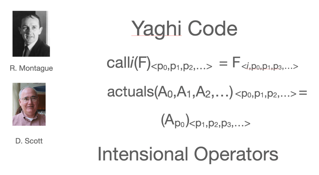 Yaghi code is based on context-switching operators that manipulate place codes. These are examples of intensional operators, as described by Richard Montague and Dana Scott. Lucid is not only computing over the Baire Space, it is intensional programming.