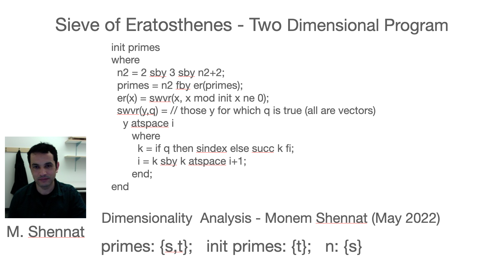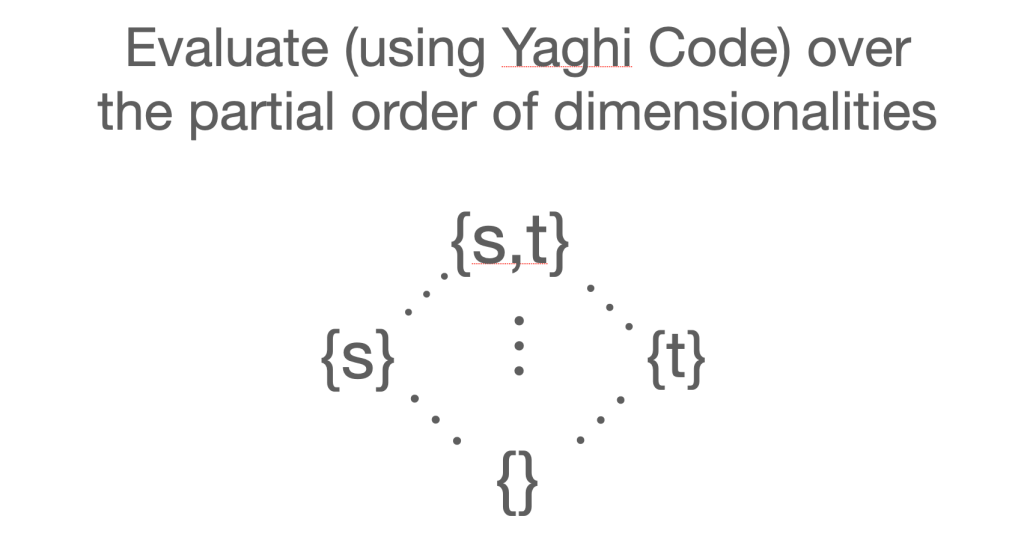 One of the advantages of eduction is that it easily extends to multiple dimensions. Here is a program that uses a space dimension s as well as a time dimension t. An efficient implementation needs to know which dimensions a variable actually depends on. This is dimensionality analysis and is the topic of Monem Shennat’s PhD (May 2022).