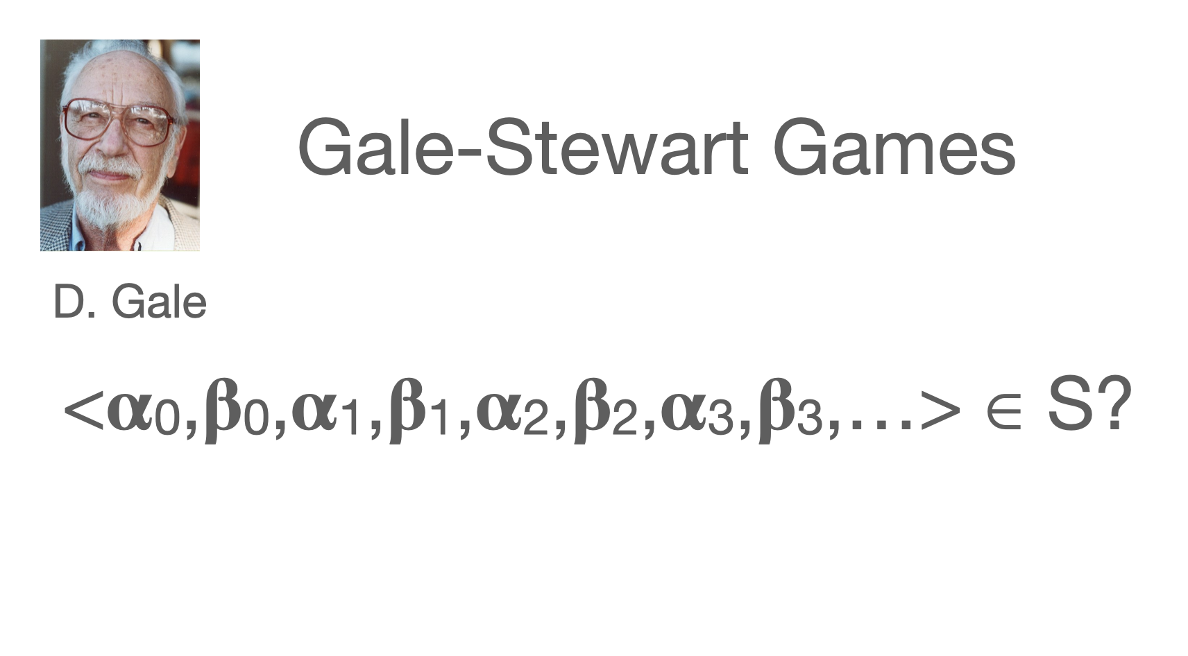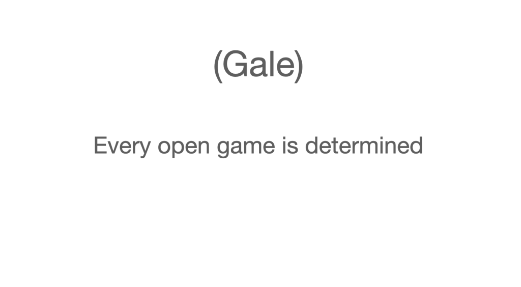 I had one huge advantage over Keldych, I learned about infinite games (from Addison, of course). Every subset of the Baire Space determines such a game. Players one and two alternate play natural numbers indefinitely and construct an element of the Baire Space.