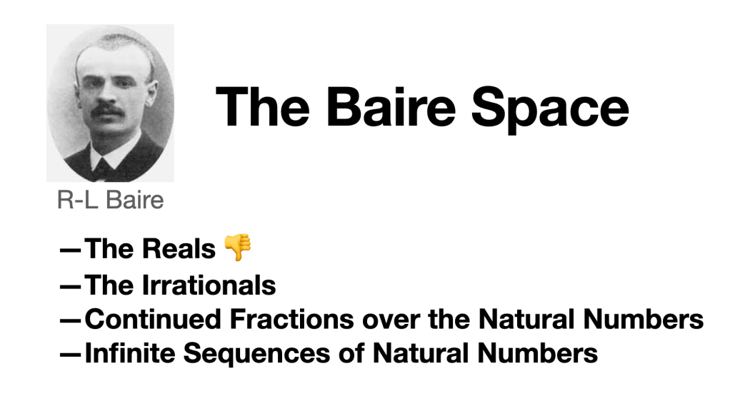 Topologists started studying the reals but discovered they were very inconvenient – for example the product of the reals with itself is not isomorphic to the reals. If you take only the irrationals, these problems disappear. Every irrational has a unique continued fraction expansion and vice versa. Eventually they dropped the fractions and worked directly with infinite sequences of natural numbers – the modern Baire Space.