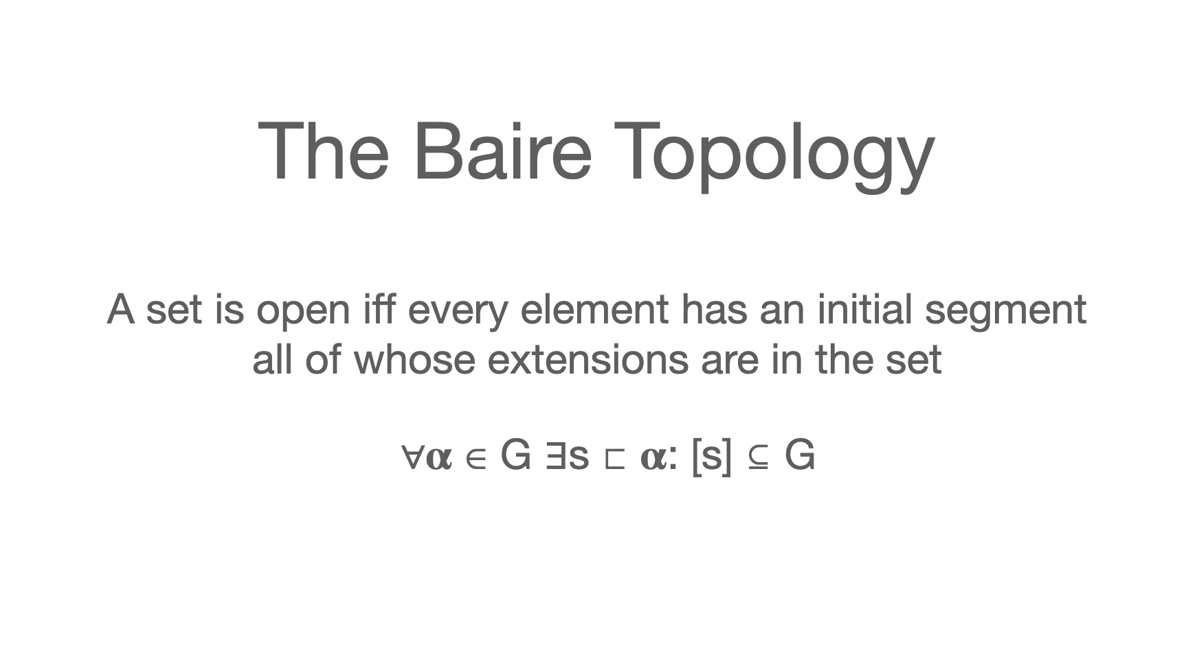 In terms of sequences, the Baire Space has the finite-open topology. Two elements are close if they have a long common initial segment. A set is open if all points sufficiently close to an element are also in the set.