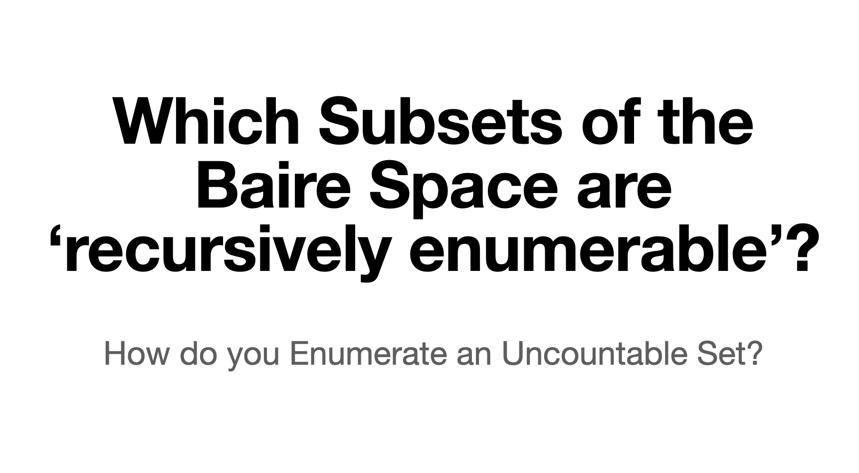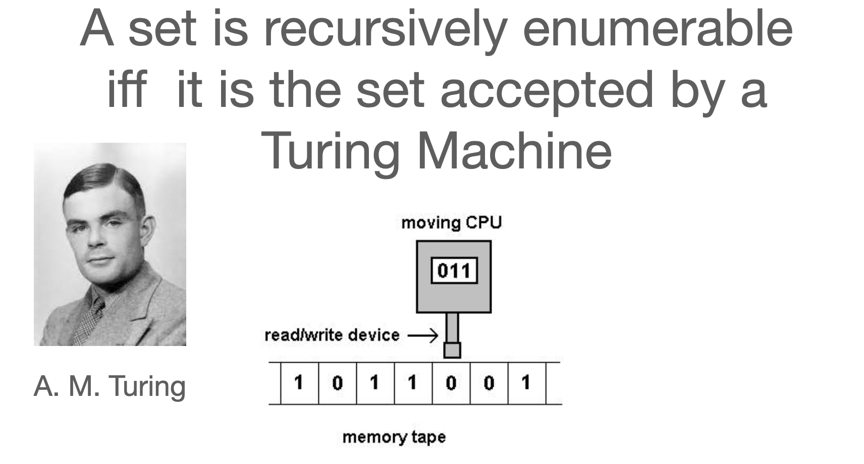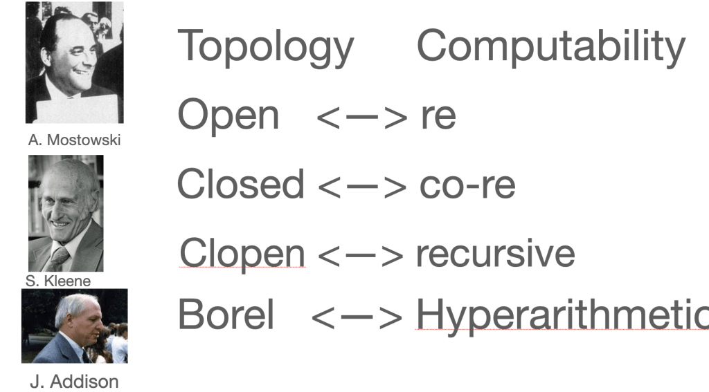 Addison then took up a fascinating topic, an analogy between topology and recursive function theory. A set is re (recursively enumerable) if some continuously operating machine can list (enumerate) its members. How can you enumerate can uncountably infinite set?