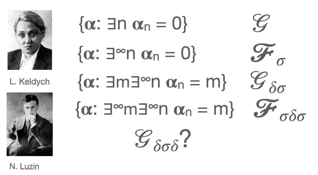 Keldysh had set herself the task if finding simple sets that witnessed the fact that Borel hierarchy was not degenerate. She came up with these four sets. The first is open and it is easy to see it’s not closed – <1,1,1,..> is a limit point of the set but not in the set. Showing that the fourth one (all sequences where infinitely many numbers appear infinitely often) is no simpler using techniques of that time is exceedingly difficult. Luzin included the proofs in his book