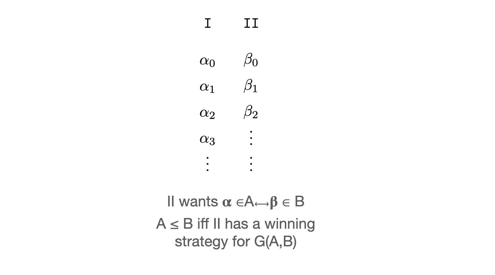 All this suggested a game in which every strategy is a continuous function and every continuous function is a strategy. Given two subsets A and B of the Baire Space, G(A,B) is a two player game in which on each move I plays a natural number and II plays a natural number or passes – but not forever. II is trying to imitate I and wins if his sequence bears the same relationship to B as I’s sequence does to A. This game characterizes ≤.