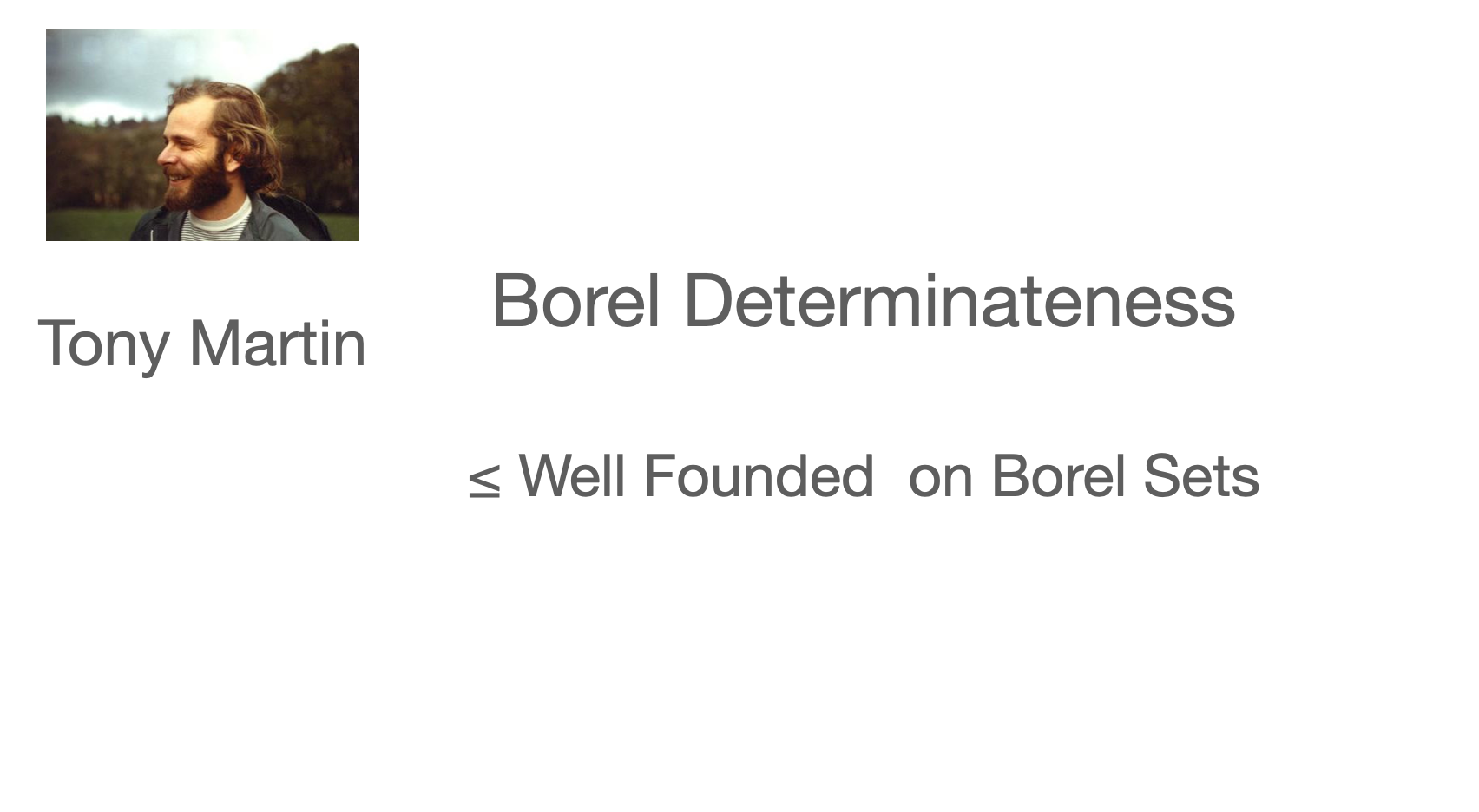 Tony Martin, a real heavy weight, proved that all Borel sets are determined – a brilliant proof. This simplified my task of describing the Borel degrees (which he showed were, modulo negation, well ordered).