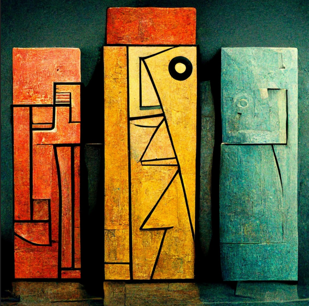The first is an abstract image in the style of Picasso. I can’t find the original but MidJourney’s version is just marvellous. I’d have no hesitation to print it, frame it, and hang it on my wall.